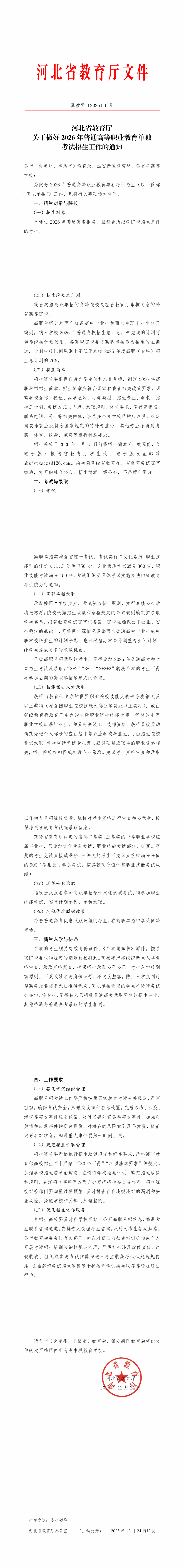 河北省教育厅关于做好2026年河北省普通高等职业教育单独考试招生工作的通知